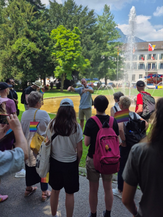 07.07.2025 * * * Dem Verzehr nach hat die erste Glarus Pride vermutlich gegen 800 Gäste angezogen. Bei allen drei Foodtrucks hiess es schlussendlich «ausverkauft». Angekündigt hatte sich das grosse Interesse im Vorfeld durch die ausgebuchte Stadtführung. Selbst die kurzfristige Aufstockung der Kapazität änderte nichts daran, dass alle vier Rundgänge mit dem Historischen Verein des Kantons Glarus, dem Regenbogenhaus Zürich und dem Verein «Hössli Haus» ausgebucht waren. Das wohlwollende und fröhliche Publikum zeichnete sich durch die Vielfalt aus, die sich die Veranstalter*innen erhofft hatten: Alle Generationen und eine perfekte Mischung aus interessierten Glarner*innen und Gästen von auswärts waren ebenso vertreten wie queere Personen und Allies.