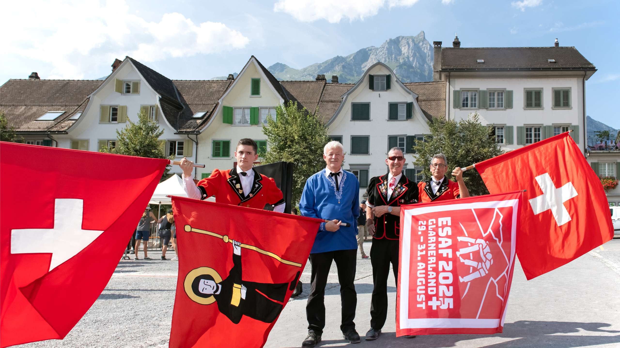 Bild 1: Die Fahnenschwinger mit Schweizer, Glarner und ESAF-Fahne (Bildrechte: OK ESAF 2025 Glarnerland+ / Maya Rhyner)