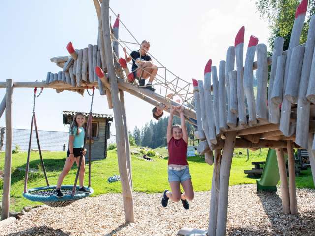 Ein Holzdrache zum Klettern, ein grosses Trampolin, ein Sandkasten mit Spielsachen, ein kleines Holzhaus, verschiedene Fahrzeuge wie Traktoren und Autos stehen für die kleinen Gäste bereit. Gemütliche Picknick Plätze am Schatten laden zum Pause machen ein.