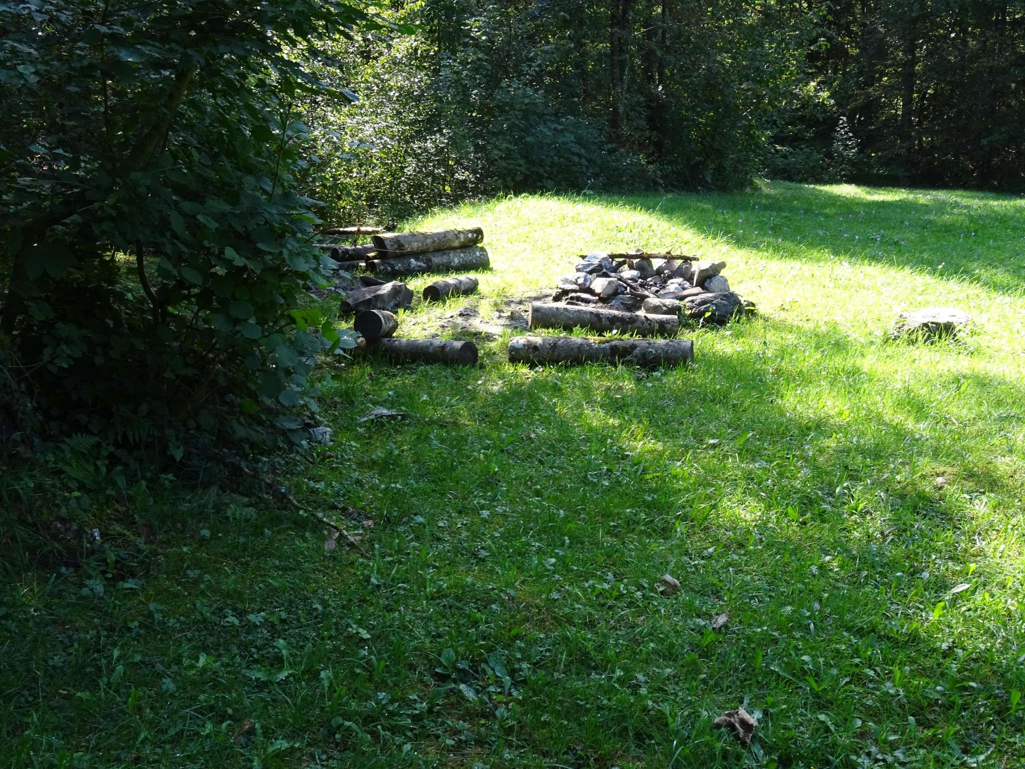 Auf dieser Anhöhe mit Wiesen und Wald befindet sich diese grosszügig gestaltete Feuerstelle.