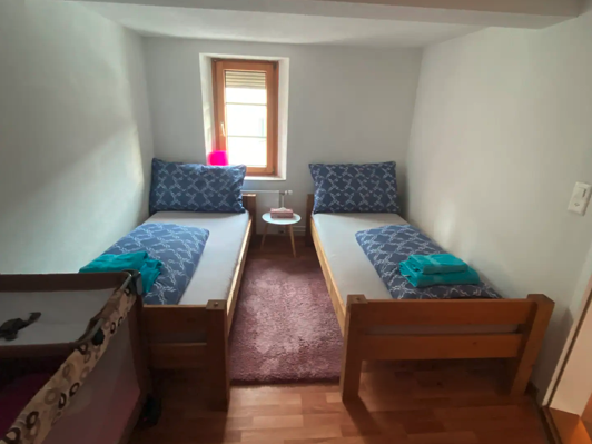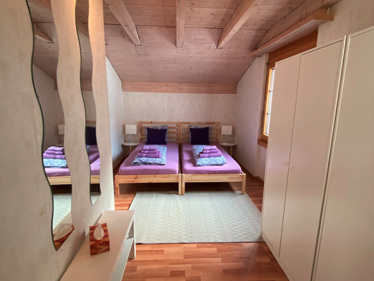 Zimmer 1 hat einen Doppelbett + Baby Bett, Zimmer 2 hat zwei Einzelbette, Zimmer 3 hat zwei Einzelbette, Zimmer 4 hat einen Einzelbett, in jedem Zimmer ist auch ein Kleiderschrank. Zimmer 5+6 sind beide nur einfach eingerichtet mit je 2 Einzelbetten und Kleiderständer.