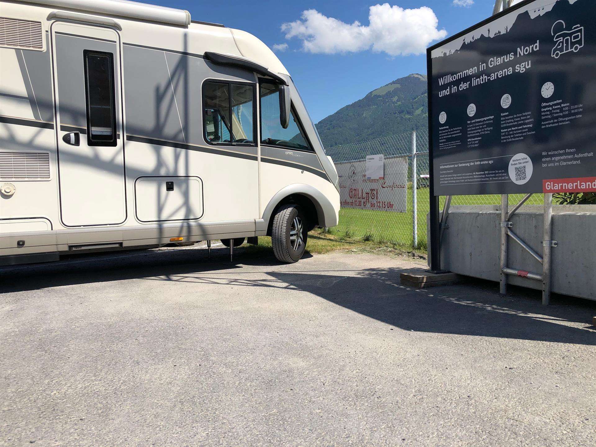 Kosten pro Fahrzeug und Nacht: CHF 22.- inkl. Kurtaxen sowie Benutzung der Toiletten und Duschen in der lintharena.