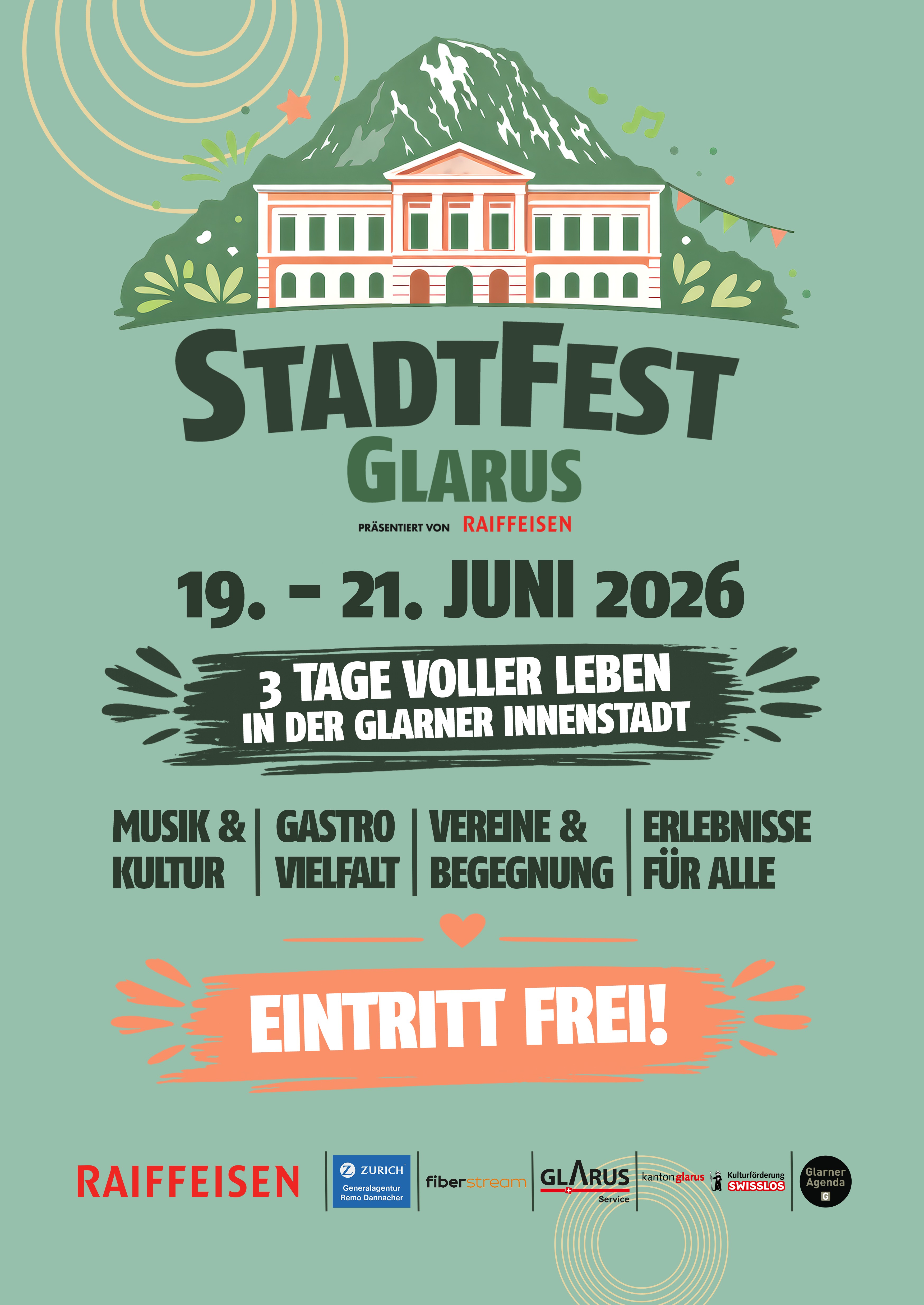 Vom 19. bis 21. Juni 2026 findet das Stadtfest Glarus im gesamten Stadtzentrum statt. Drei Tage lang erwartet dich ein abwechslungsreiches Programm mit Live-Musik, Kultur, kulinarischen Angeboten und vielfältigen Aktivitäten für Gross und Klein.