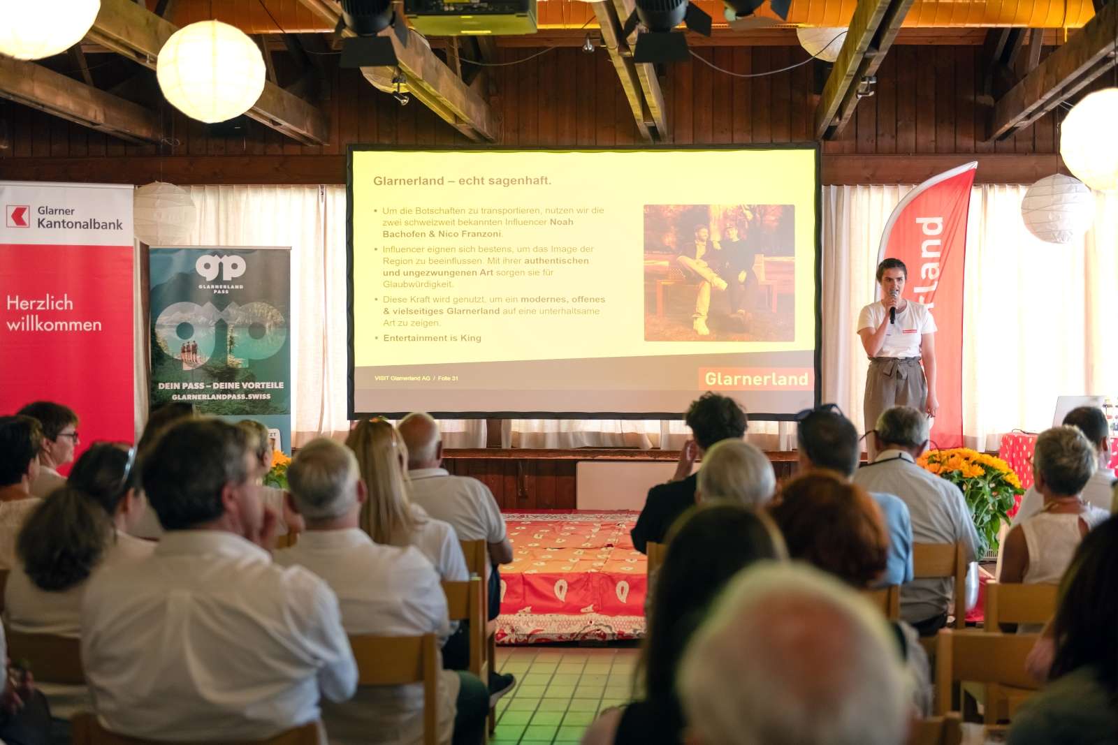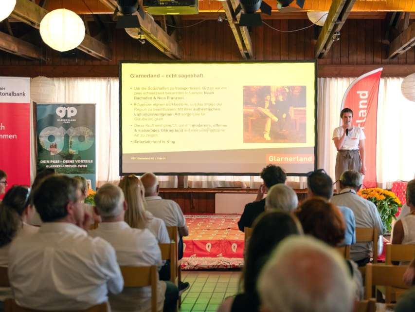 Fridolin Hösli, Janina Schiesser und Sandra Green präsentierten aktuelle Projekte von VISIT Glarnerland. Green stellte die Funktionen des GlarnerlandPass sowie erste, erfreuliche Ergebnisse vor. Schiesser präsentierte die neue Standortkampagne «Glarnerland. Echt sagenhaft.», die gemeinsam mit Kanton, Gemeinden und Wirtschaftspartnern realisiert wird. Mit den Influencern Noah Bachofen und Nico Franzoni werden Arbeiten, Wohnen und Freizeit im Glarnerland kreativ und zielgruppengerecht in Szene gesetzt.