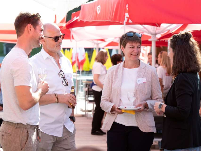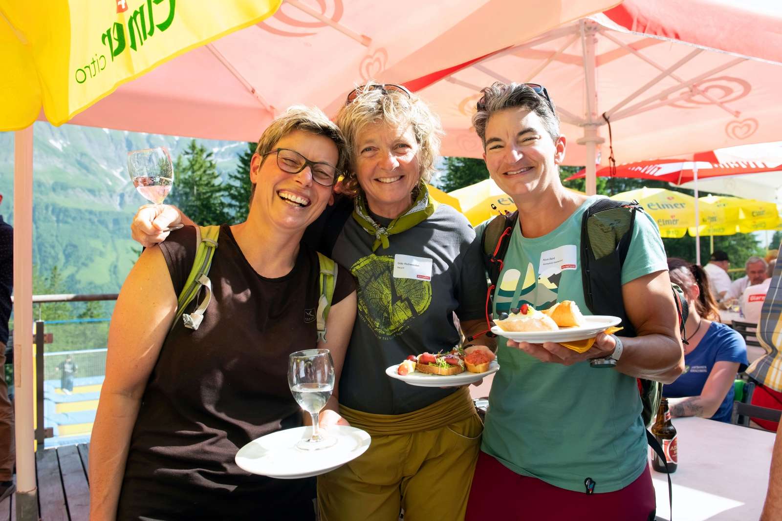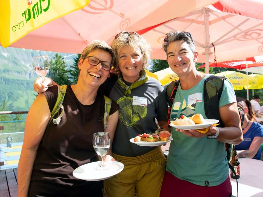 VISIT Glarnerland_Forum_2025 (7): Apéro mit Ausblick – Networking mit Blick aufs Martinsloch. V.l.n.r. Simone Landolt, Leglerhütte SAC, Gabi Aschwanden, Gemeinderätin Glarus Süd, Moni Bont, Alpinschule Glarnerland